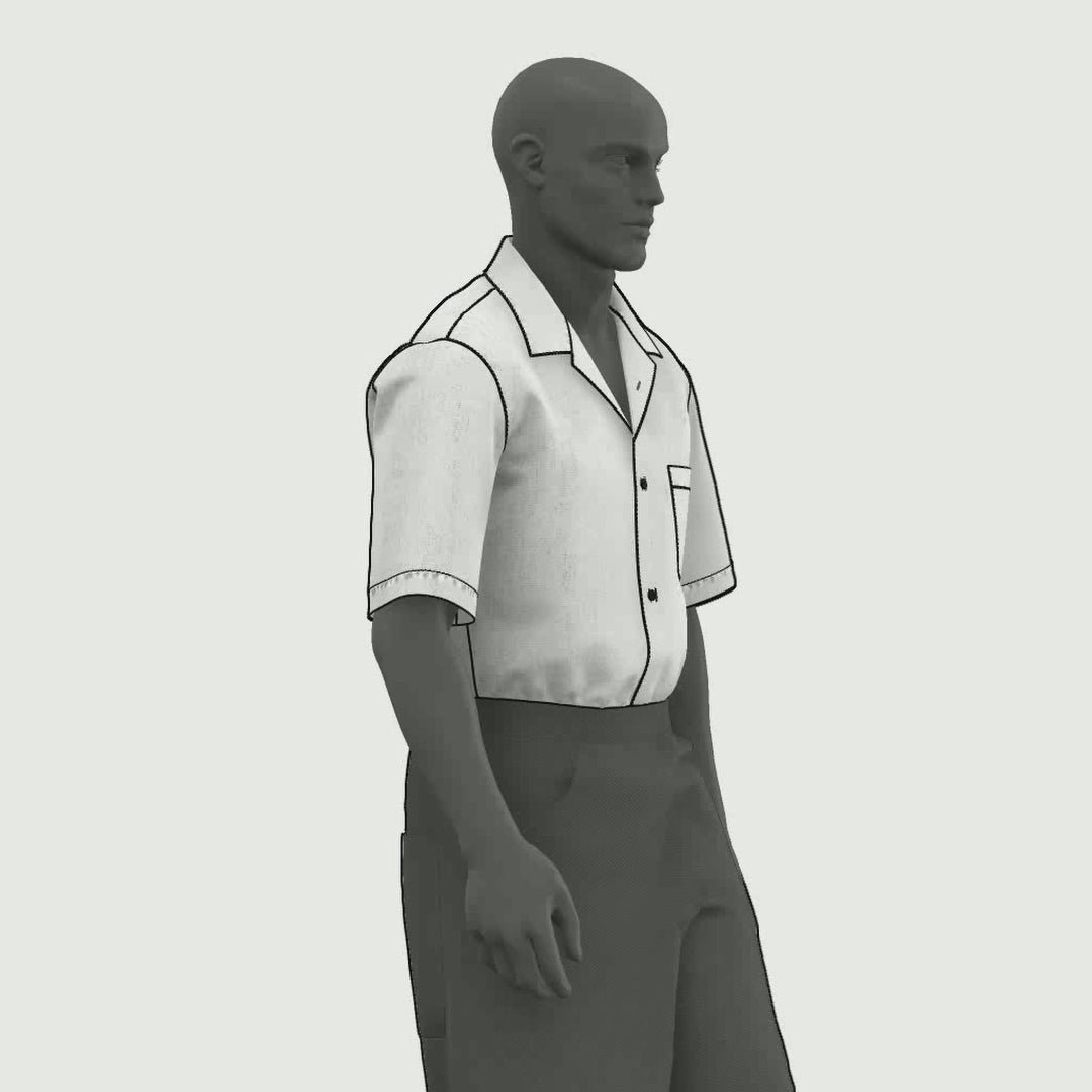 Digital Sewing Pattern and Instructions for sewing a casual short-sleeved button-up shirt, with a relaxed fit for lightweight, breathable fabrics. Features include a long front button placket and a simple one piece collar without stand. The back piece without darts and yokes allows for uninterrupted seamless prints.