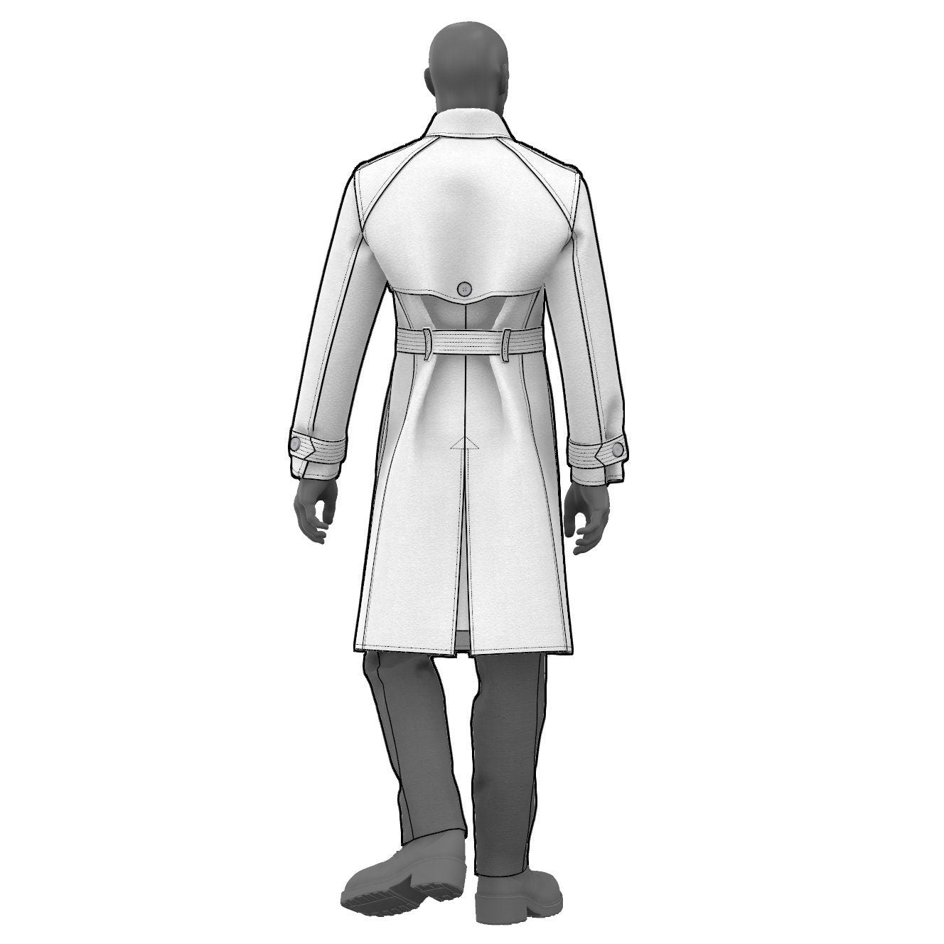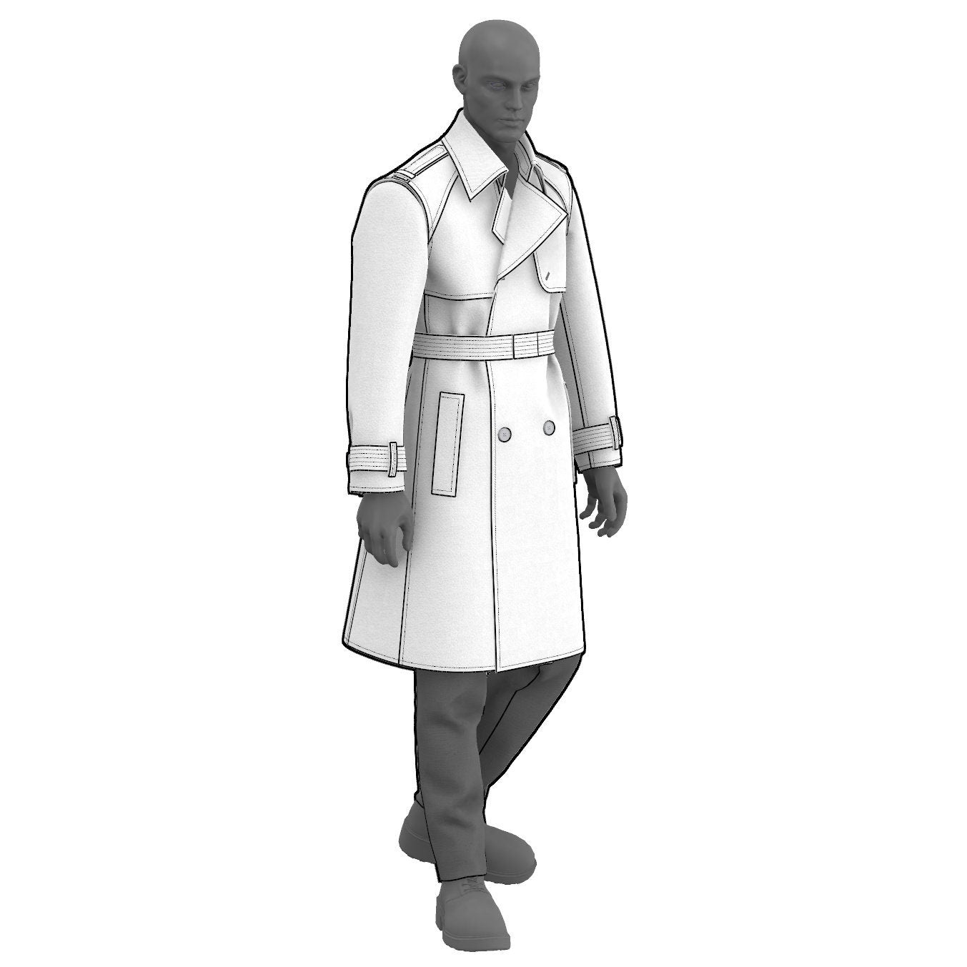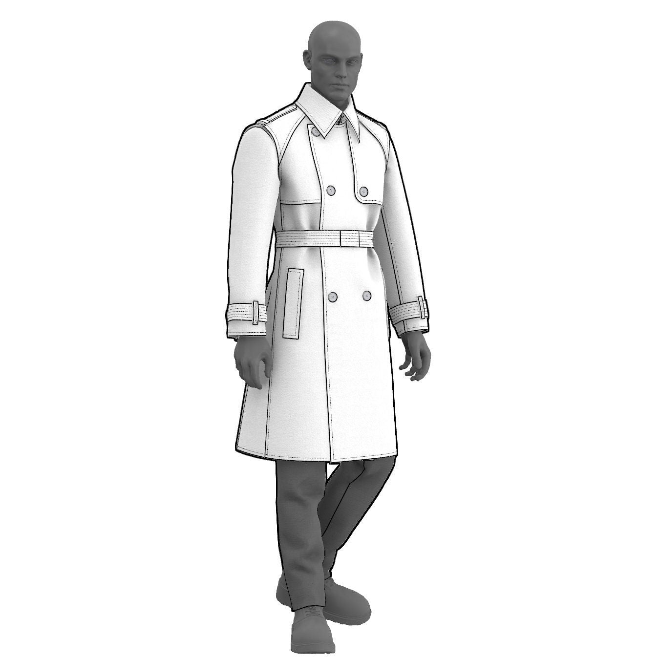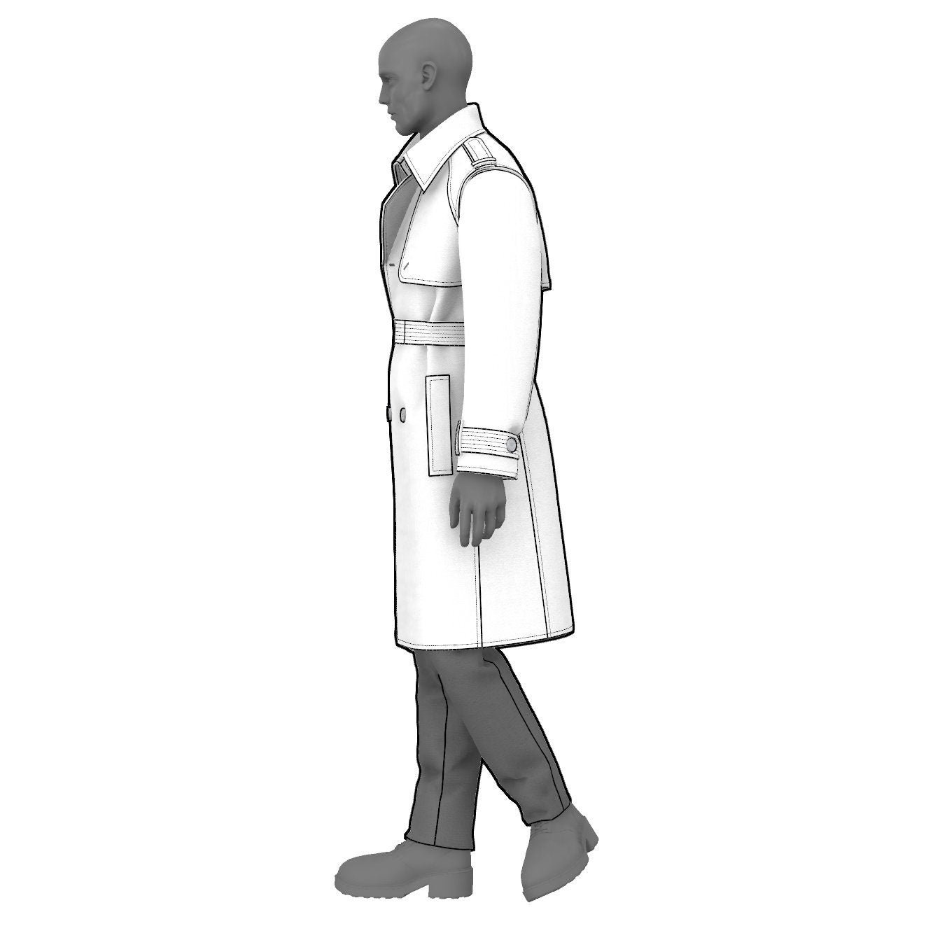 Digital Sewing Pattern and Instructions for sewing a classic double breasted trench coat with storm flaps, hip welt pockets, epaulettes, sleeve and waist belt, and a back vent. The style is fully lined.