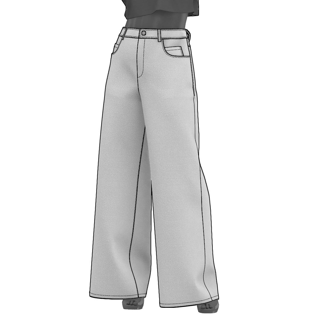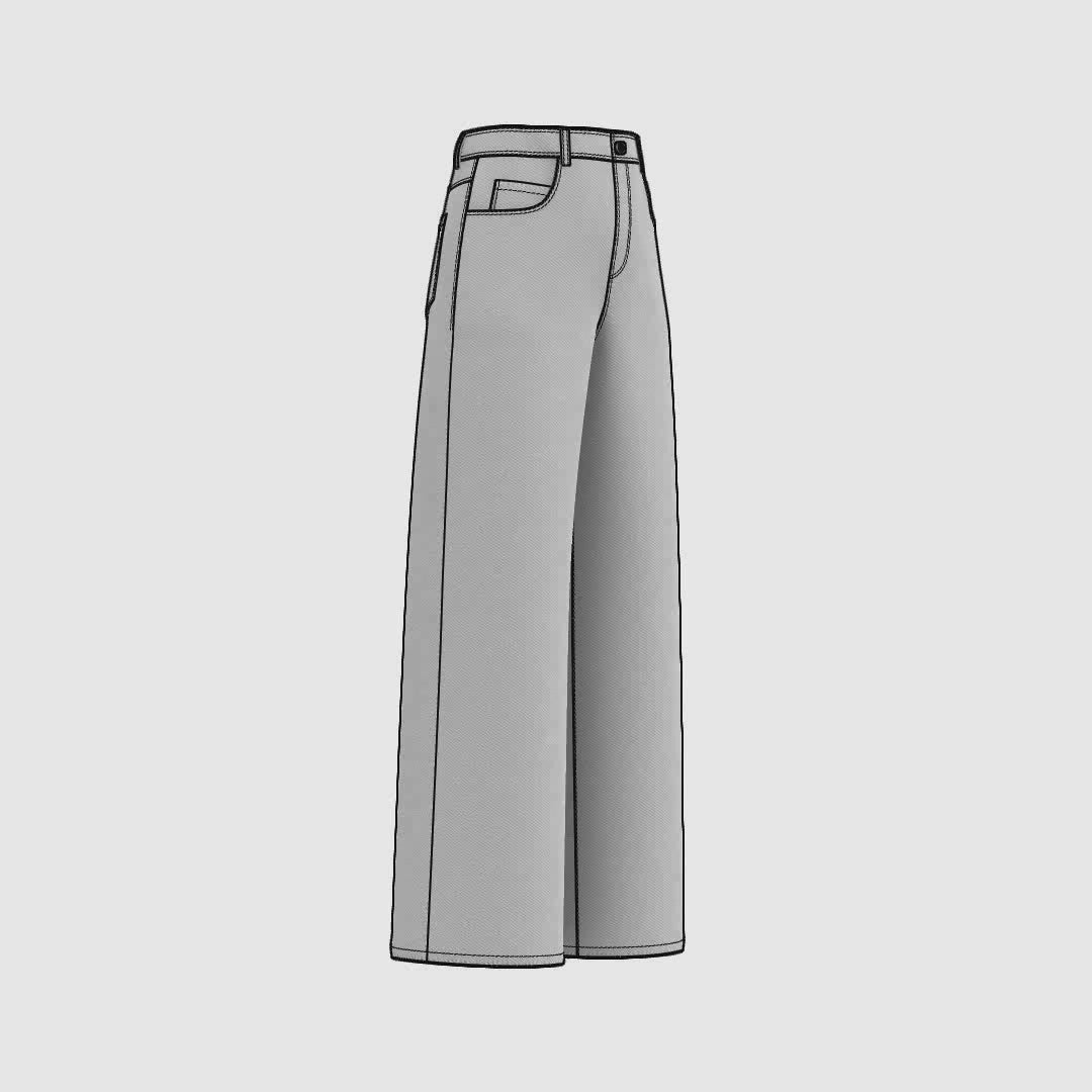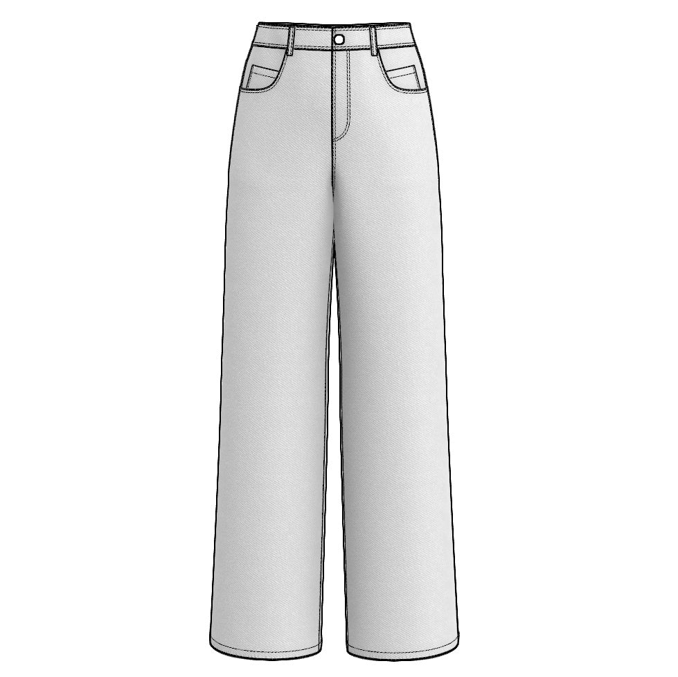 Digital Sewing Pattern and Instructions for sewing a high-waisted baggy-jeans for women. An oversized 5 pocket style with curvy front pockets, coin pockets, patched back pockets, a curved waistband and six belt loops.