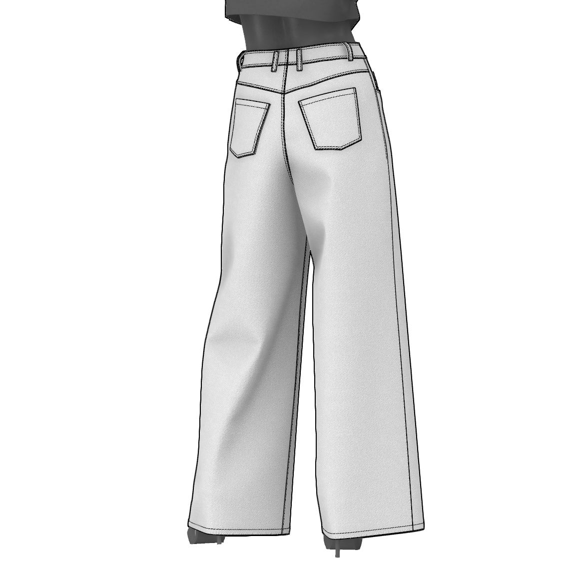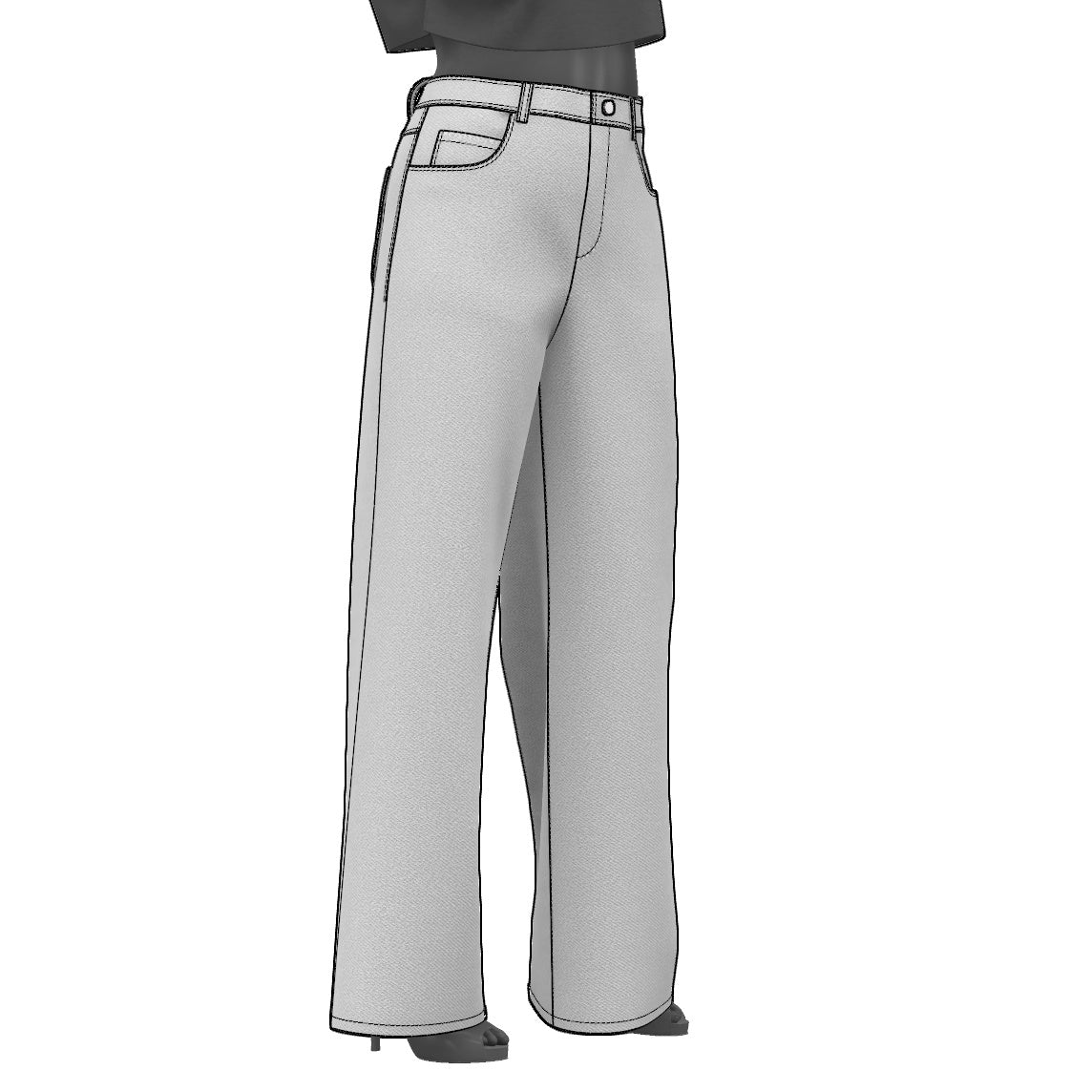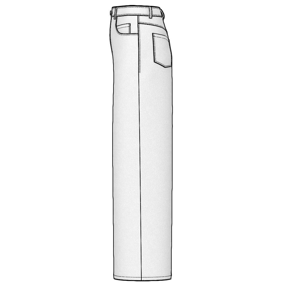 Digital Sewing Pattern and Instructions for sewing a high-waisted baggy-jeans for women. An oversized 5 pocket style with curvy front pockets, coin pockets, patched back pockets, a curved waistband and six belt loops.